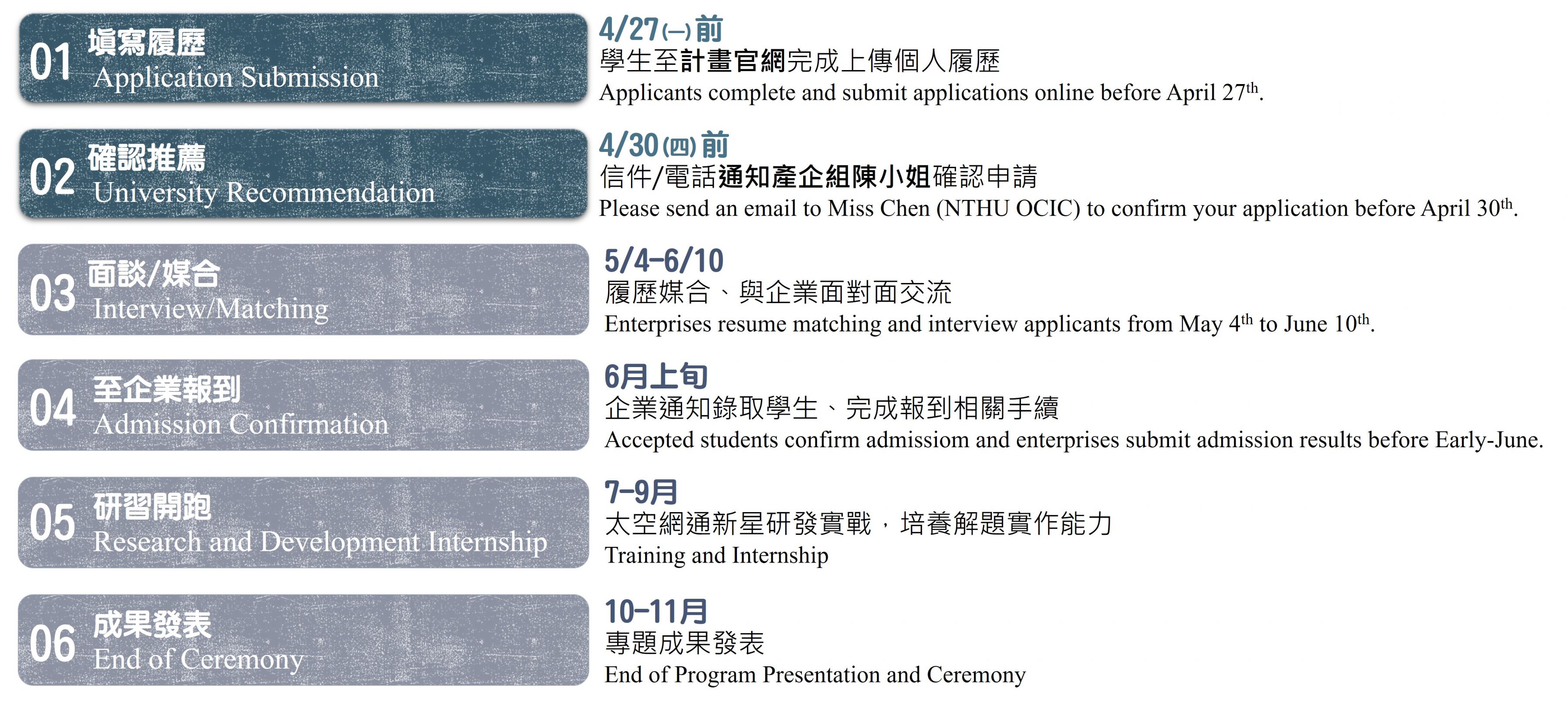 (一) 有意參加本計畫之學生,須於115年4月27日(一)前至計畫網站自行上傳履歷資料。 (二) 已上傳履歷資料者,需於115年4月28日(二)前通知本校產學企畫組,以利統整推薦名單。※聯繫窗口:陳小姐 03-5715131 #34582 yingxin-chen@mx.nthu.edu.tw※